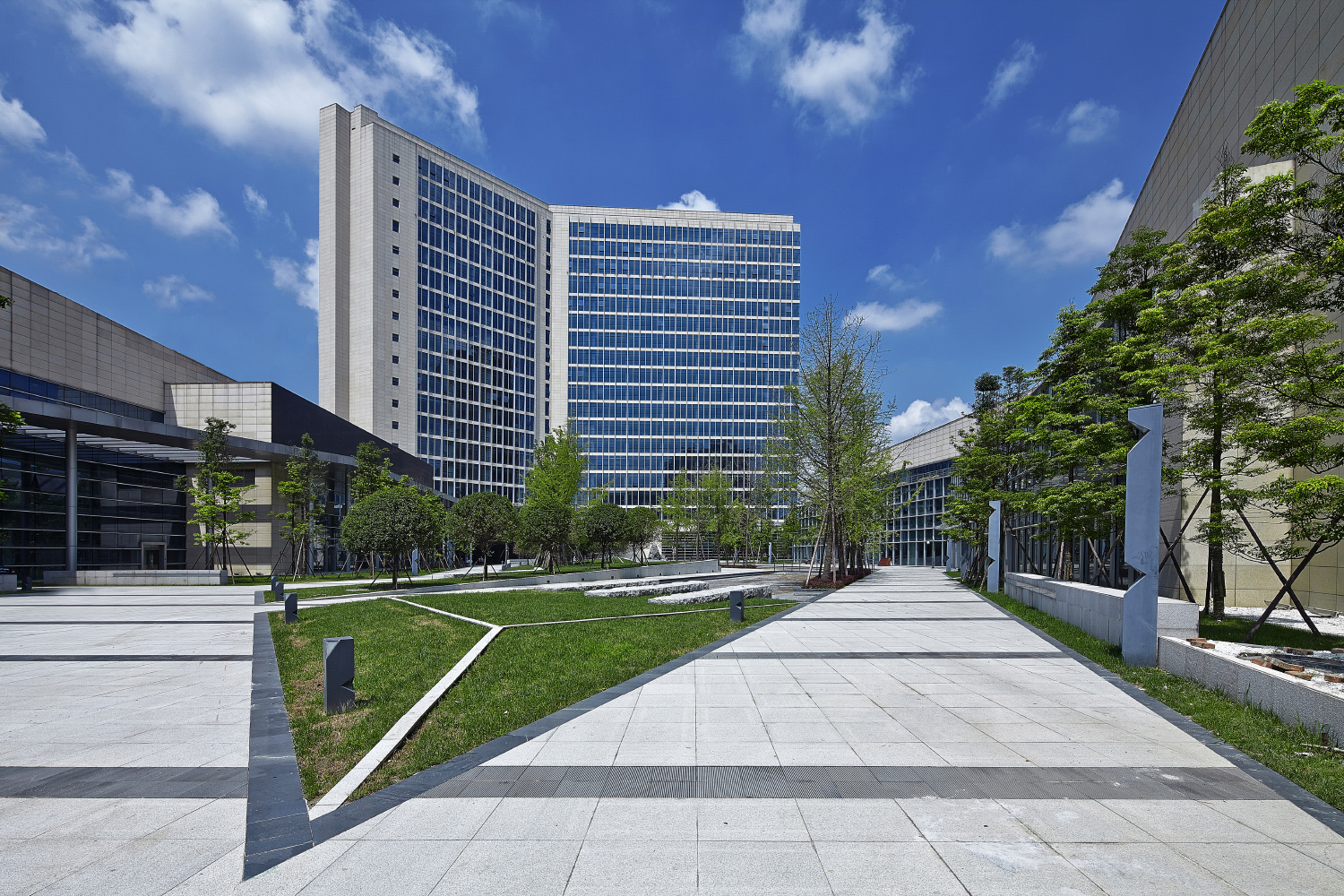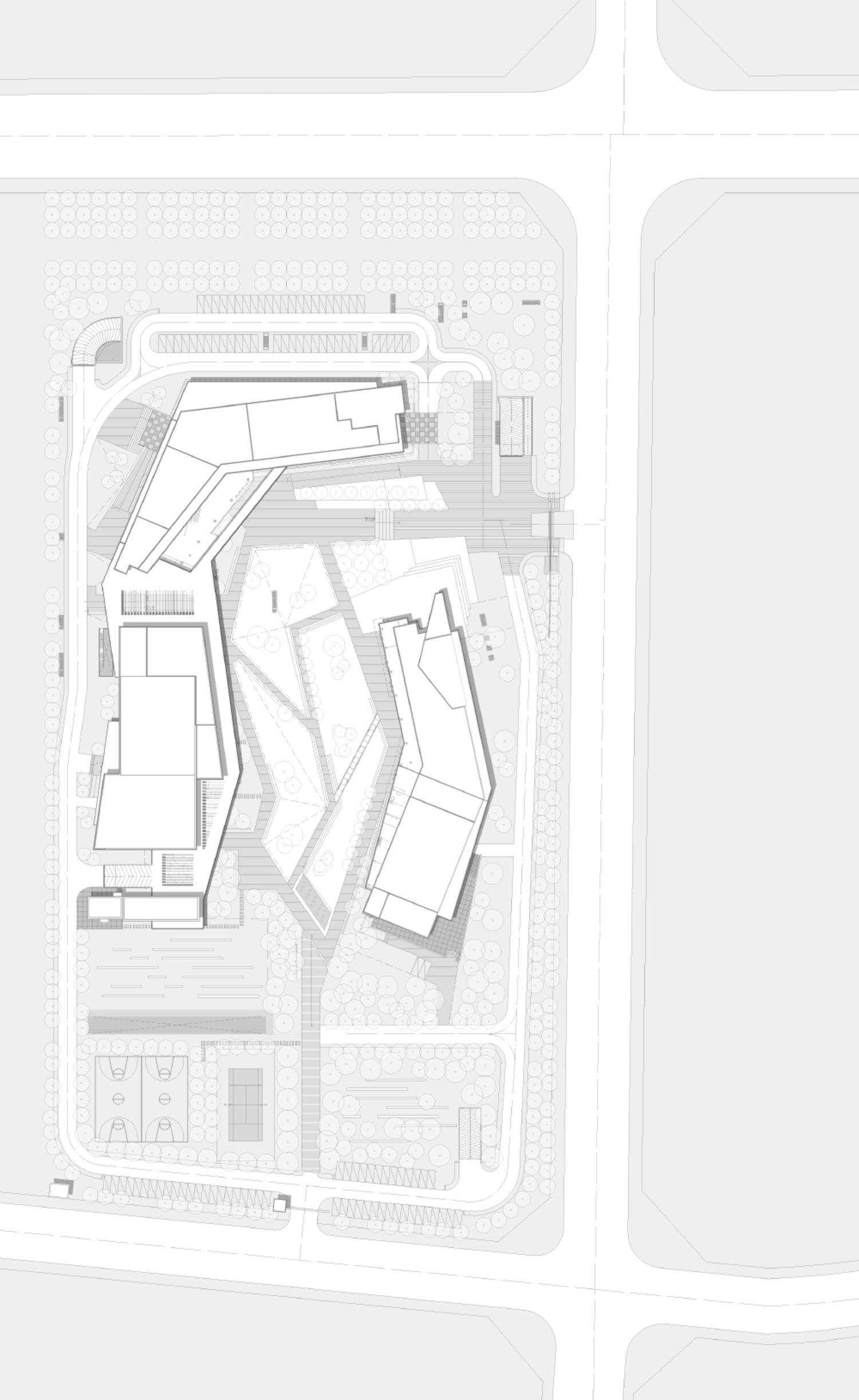 項(xiàng)目從開始就按高標(biāo)準(zhǔn)、高起點(diǎn)進(jìn)行打造,并一直受到各界廣泛關(guān)注。項(xiàng)目是由辦公主樓、檔案館、職工餐廳、職工俱樂部四幢建筑單體組成的辦公群體建筑。建筑總平面采用折板圍合式布局,形成中央大尺度辦公庭院。整體規(guī)劃圍而不合,通過建筑平面的折線扭轉(zhuǎn),形成與城市脈絡(luò)之間和諧融入。建筑折線扭轉(zhuǎn)后在用地四個(gè)角部形成的外部環(huán)境能更好地形成空間尺度及視覺體驗(yàn)上的緩沖,使建筑群體的形象更為延伸,謙遜地融入到城市環(huán)境之中。